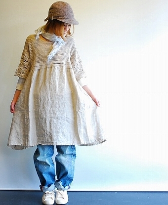 ワンピース:TANG カギ編み切替ワンピ・ベージュ ¥14,280