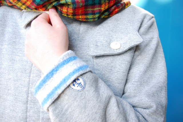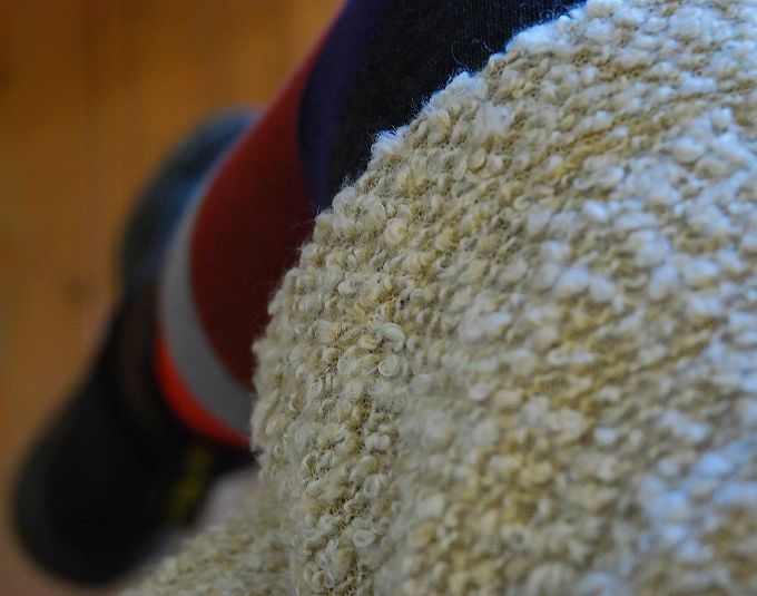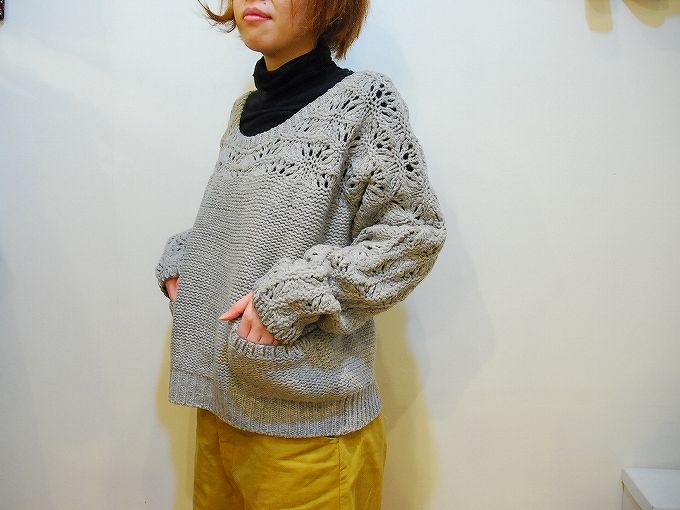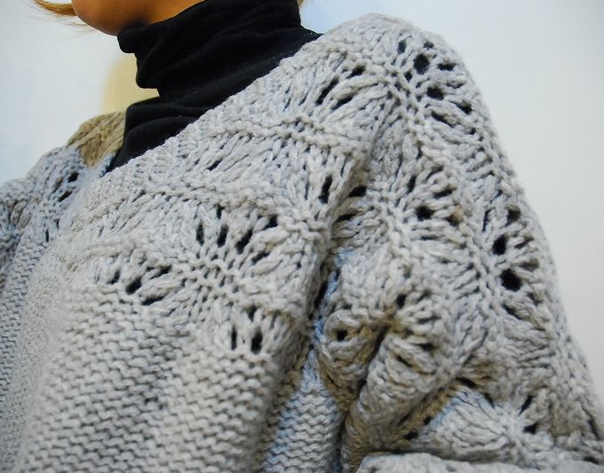 | 胸元から袖にかけて、ざっくり模様編みがしてあります。 |