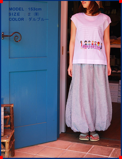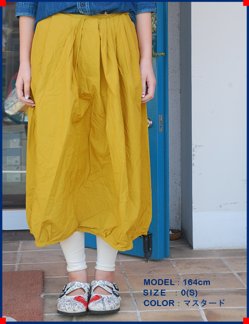 ギャザースカートに合わせてワークシャツやマリンパーカーなど組みわせで楽しめるかと思います。