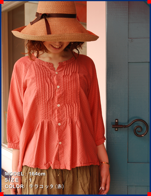 prit ローン水玉プリント7分袖ピンタックノーカラーブラウス ¥11,550