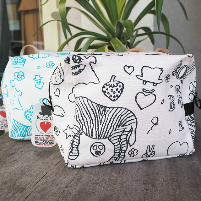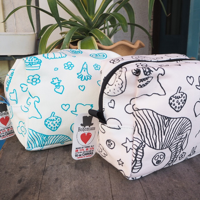 ボヘミアンズのゼブラやスカル、カブトムシのキャラクターが手書き風に描かれたポーチです。